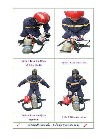 Bước 4: Kiểm tra độ kín Bước 5: Kiểm tra còi báo hệ thống dẫn khí Bước 6: Kiểm tra độ kín Bước 7: Kiểm tra van xả mặt trùm An toàn để chiến đấu – Kiểm tra trước khi dùng