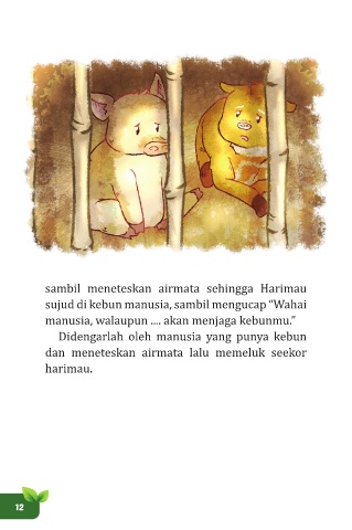 sambil meneteskan airmata sehingga Harimau sujud di kebun manusia, sambil mengucap “Wahai manusia, walaupun .... akan menjaga kebunmu.” Didengarlah oleh manusia yang punya kebun dan meneteskan airmata lalu memeluk seekor harimau. 12