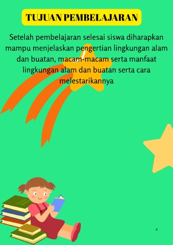 TUJUAN PEMBELAJARAN Setelah pembelajaran selesai siswa diharapkan mampu menjelaskan pengertian lingkungan alam dan buatan, macam-macam serta manfaat lingkungan alam dan buatan serta cara melestarikannya 4