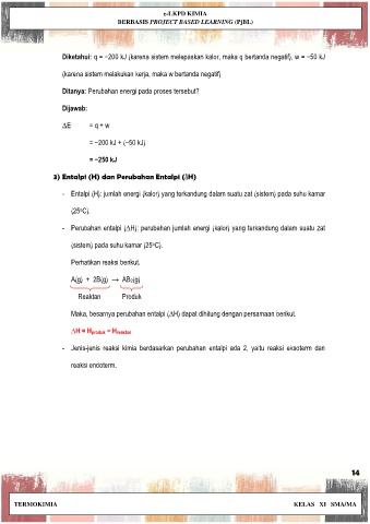 Diketahui: q = −200 kJ (karena sistem melepaskan kalor, maka q bertanda negatif), w = −50 kJ