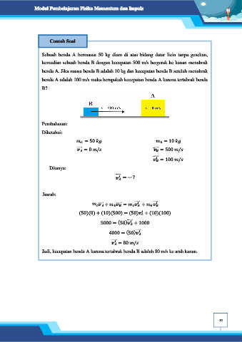 Jadi, kecepatan benda A karena tertabrak benda B adalah 80 m/s ke arah kanan.