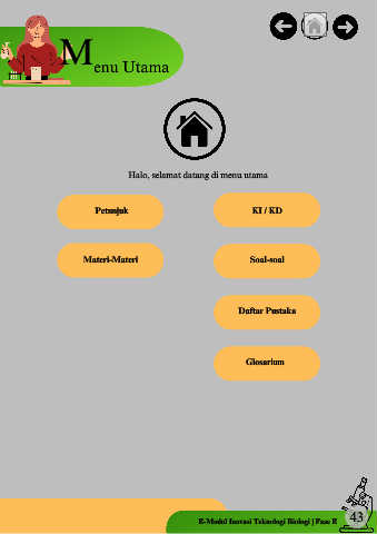 M enu Utama Halo, selamat datang di menu utama Petunjuk KI / KD Materi-Materi Soal-soal Daftar Pustaka Glosarium 43 E-Modul Inovasi Teknologi Biologi | Fase E