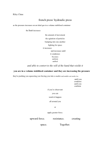 french press/ hydraulic press as the pressure increases on an ideal gas in a volume stabilized container