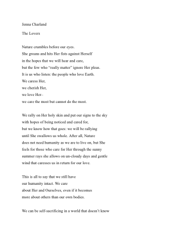 but the few who “really matter” ignore Her pleas. It is us who listen: the people who love Earth. We caress Her,