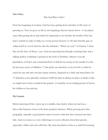 From the beginning of creation, God has been getting down and dirty in His ways of pursuing us. First, he gives us life in our beginning when he kneels down—I can almost sense Him getting dirt in and under his fingernails as he breathes the breath of life into man’s nostrils in order to make us a living person (Genesis 2). He later literally gets on Adam and Eve’s level when he asks the infamous, “Where are you?” in Genesis 3 when they ate the fruit. In Moses’ case, God was pursuing him through a burning bush, and a talking donkey in Balaam’s position in the book of Numbers. Maybe it was the playfulness of God to ask a frustrated Peter to find his tax money in the mouth of a fish, his previous career, in Matthew 17 that grabs our attention; or my favorite is when he snuck his one and only son into enemy territory, disguised as a baby and stayed there for 33 blameless years patiently waiting to fulfill his plan in taking our place in death so that we might turn to him as found in the gospels. A beautiful, never-ending pursuit of God to his children of you and me.