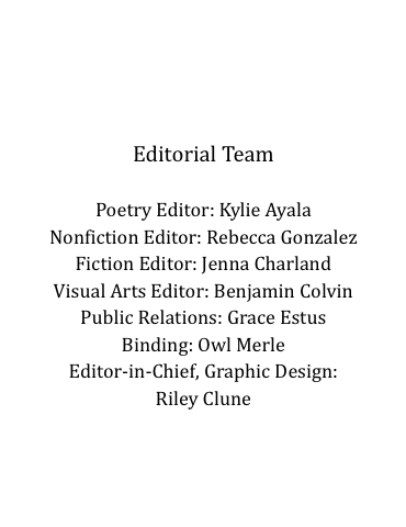 Editorial Team Poetry Editor: Kylie Ayala Nonfiction Editor: Rebecca Gonzalez Fiction Editor: Jenna Charland Visual Arts Editor: Benjamin Colvin Public Relations: Grace Estus Binding: Owl Merle Editor-in-Chief, Graphic Design: Riley Clune