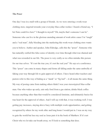 One day I was in a mall with a group of friends. As we were entering a work-wear clothing store, targeted towards your everyday blue-collar worker. I heard a friend say, “I bet Nate could live here!” I thought to myself “Oh, maybe that’s someone I can be”. Someone who can live in the glorious unending amount of work attire cause I’m “tough” and a “real man”, fully bleeding into the marketing this work-wear clothing store wants you to believe. Author and speaker, John Eldredge, calls this the “poser”. Someone who has naturally crafted this false sense of identity over time through what was shamed and what was rewarded in our life. The poser is very crafty as we often mistake this person for our true selves. “It’s not the true you, it’s not the real you!” He says at a conference. This “poser” can come in many shapes and forms all falling under the same umbrella of faking your way through life to gain approval of others. I have heard other teachers and pastors refer to this way of hiding as a “mask” or “fig leaf”—it all means the same thing. My way of posing came from making others think I was your stereotypical blue-collar man. One who wakes up early, eats only food from a gas station, drinks black coffee because anything other than that would be considered feminine, and ultimately buries his true heart for the approval of others. And I will say with that, it was working well. I was getting pay increases, staying above busy with multiple work opportunities, and getting recognized by others for my work ethic and long hours I would put in. I was on my way to gain the world but lose my soul as Jesus puts it in the book of Matthew. If it’s not Christ who we let take our breath away, we’ll look to something that does.