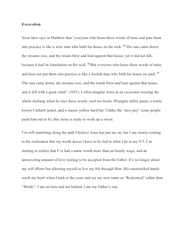 I’m still stumbling along the path I believe Jesus has put me on; but I am slowly coming to the realization that my worth doesn’t have to be tied to what I do in my 9-5. I’m starting to realize that I’ve had a name worth more than an hourly wage, and an unwavering amount of love waiting to be accepted from the Father. It’s no longer about my self efforts but allowing myself to live my life through Him. His outstretched hands reach my heart when I look at the cross and see my new name as “Redeemed” rather than “Works”. I am on time and not behind. I am my Father’s son.