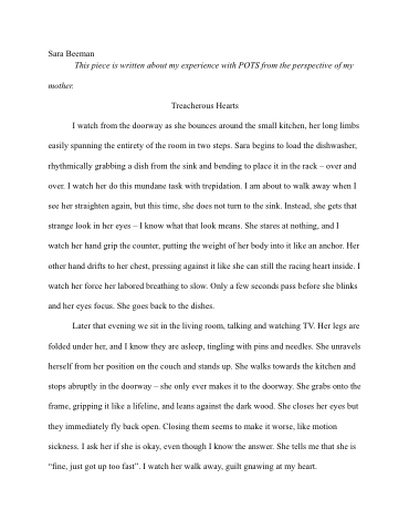 easily spanning the entirety of the room in two steps. Sara begins to load the dishwasher, rhythmically grabbing a dish from the sink and bending to place it in the rack – over and over. I watch her do this mundane task with trepidation. I am about to walk away when I see her straighten again, but this time, she does not turn to the sink. Instead, she gets that strange look in her eyes – I know what that look means. She stares at nothing, and I watch her hand grip the counter, putting the weight of her body into it like an anchor. Her other hand drifts to her chest, pressing against it like she can still the racing heart inside. I watch her force her labored breathing to slow. Only a few seconds pass before she blinks and her eyes focus. She goes back to the dishes.