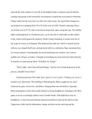 road out the wide windows to my left. It felt slightly better to immerse myself with the comings and goings of the townsfolk. Our property occupied the exact point at which the village ended, but the town line was still a few miles away. The speed limit changed on our property too, jumping from 30 to 55 at the crest of a hill. I found it amusing when a car hit that crest at 65-70, only to decelerate desperately upon seeing the sign. The darting lights would approach at a breakneck pace, yet by the time I could make out the outline of the vehicle itself against the shadowy North Country backdrop, it would crawl out of my scope of vision, as if fatigued. This distracted me until one vehicle I tracked closely with my eyes shaped itself into a pickup truck with two confederate flags streaming from its vertical exhaust. Coincidentally, the truck hurtled past my window view with an audible roar. All gas, no brakes. I thought of something my mom had said earlier that day in response to some pop-up about “Tech Bros for Trump:”