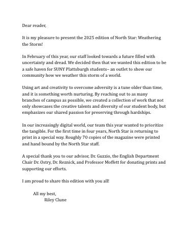 In February of this year, our staff looked towards a future filled with uncertainty and dread. We decided then that we wanted this edition to be a safe haven for SUNY Plattsburgh students– an outlet to show our community how we weather this storm of a world.