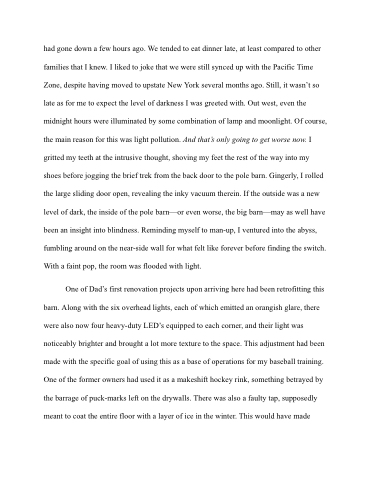 had gone down a few hours ago. We tended to eat dinner late, at least compared to other families that I knew. I liked to joke that we were still synced up with the Pacific Time Zone, despite having moved to upstate New York several months ago. Still, it wasn’t so late as for me to expect the level of darkness I was greeted with. Out west, even the midnight hours were illuminated by some combination of lamp and moonlight. Of course, the main reason for this was light pollution. And that’s only going to get worse now. I gritted my teeth at the intrusive thought, shoving my feet the rest of the way into my shoes before jogging the brief trek from the back door to the pole barn. Gingerly, I rolled the large sliding door open, revealing the inky vacuum therein. If the outside was a new level of dark, the inside of the pole barn—or even worse, the big barn—may as well have been an insight into blindness. Reminding myself to man-up, I ventured into the abyss, fumbling around on the near-side wall for what felt like forever before finding the switch. With a faint pop, the room was flooded with light.