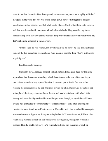 sense to me had the entire floor been paved, but concrete only covered roughly a third of the space in the barn. The rest was loose, sandy dirt, a surface I struggled to imagine transforming into a sheet of ice. But what would I know. Most of the floor, both concrete and dirt, was littered with more than a hundred tennis balls. I began collecting these, consolidating them into two plastic buckets. They were nearly all accounted for when my dad’s silhouette appeared in the doorway.