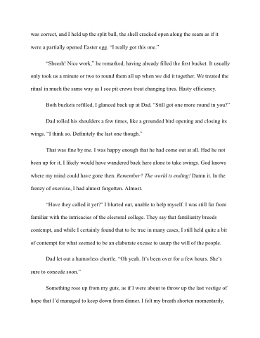 “Have they called it yet?” I blurted out, unable to help myself. I was still far from familiar with the intricacies of the electoral college. They say that familiarity breeds contempt, and while I certainly found that to be true in many cases, I still held quite a bit of contempt for what seemed to be an elaborate excuse to usurp the will of the people.