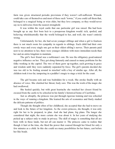 Though she thought often of her childhood, she accepted that she had to move on and look to the future of her kingdom. As the crown princess, she thought, it was only right for her to be prepared, to plan. And she had plans, big plans. The longer she considered that night, the more certain she was about it. In her years of studying she picked up a subject only to study in privacy. The skill of magic is something that all are born with in these lands, but not all can master it. The princess came to realize that though it hurt at the time, she liked the power that coursed through her blood for only a few minutes as a child. In this she could see many possibilities for her future, cast before her like beads.