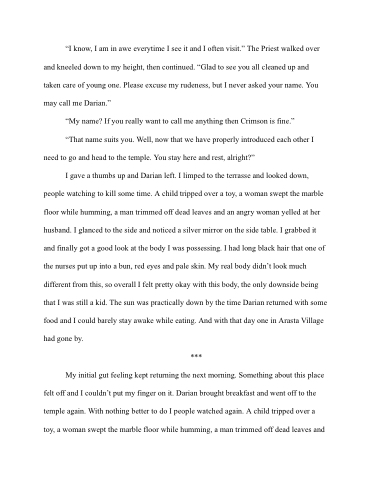 I gave a thumbs up and Darian left. I limped to the terrasse and looked down, people watching to kill some time. A child tripped over a toy, a woman swept the marble floor while humming, a man trimmed off dead leaves and an angry woman yelled at her husband. I glanced to the side and noticed a silver mirror on the side table. I grabbed it and finally got a good look at the body I was possessing. I had long black hair that one of the nurses put up into a bun, red eyes and pale skin. My real body didn’t look much different from this, so overall I felt pretty okay with this body, the only downside being that I was still a kid. The sun was practically down by the time Darian returned with some food and I could barely stay awake while eating. And with that day one in Arasta Village had gone by.