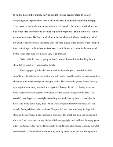 to find so I decided to explore the village a little before heading there. In the day everything was a splendour to look at but in the dark, it looked abandoned and empty. There were no torches lit and no one was in sight. I quickly but quietly snuck alongside a wall when I ran into someone face first. My first thought was “Shit! I’m busted,” but the person didn’t move. Baffled, I walked up to them and almost felt my heart jump out of my chest. The person wore that same armor like the guards at the gate but when I looked them in their eyes, only hollow sockets looked back. It was a skeleton in the armor and by the looks of it, the person died a very long time ago.
