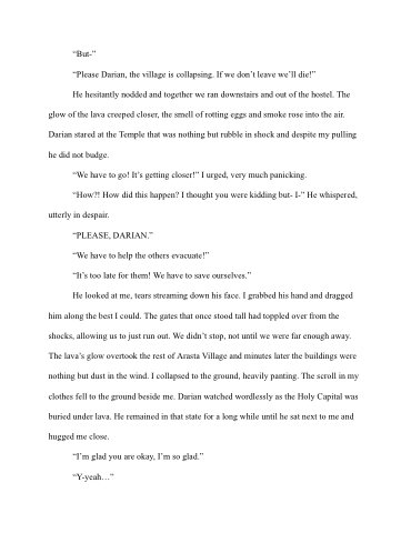 him along the best I could. The gates that once stood tall had toppled over from the shocks, allowing us to just run out. We didn’t stop, not until we were far enough away. The lava’s glow overtook the rest of Arasta Village and minutes later the buildings were nothing but dust in the wind. I collapsed to the ground, heavily panting. The scroll in my clothes fell to the ground beside me. Darian watched wordlessly as the Holy Capital was buried under lava. He remained in that state for a long while until he sat next to me and hugged me close.