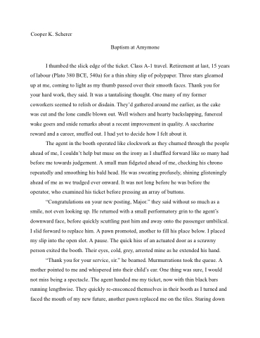 I thumbed the slick edge of the ticket. Class A-1 travel. Retirement at last, 15 years of labour (Plato 380 BCE, 540a) for a thin shiny slip of polypaper. Three stars gleamed up at me, coming to light as my thumb passed over their smooth faces. Thank you for your hard work, they said. It was a tantalising thought. One many of my former coworkers seemed to relish or disdain. They’d gathered around me earlier, as the cake was cut and the lone candle blown out. Well wishers and hearty backslapping, funereal wake goers and snide remarks about a recent improvement in quality. A saccharine reward and a career, snuffed out. I had yet to decide how I felt about it.