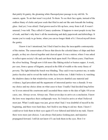 that palely lit gantry, the gleaming white fluoropolymer passage to my old life. To sunsets, again. To air that wasn’t recycled. To them. To see their face again, instead of the endless litany of clerks and poor souls that filed in and out like ants beneath the looking glass. And yet, I was afraid. I had grown used to life up here, away from it all. It wasn’t unusual, I was told. They called it Canary syndrome. It happens to most people in my line of work, and that’s why there’s all the monitoring and daily paperwork and debriefings. It means you’re ready to go home, when you can no longer think of it. I forced myself down the gantry.