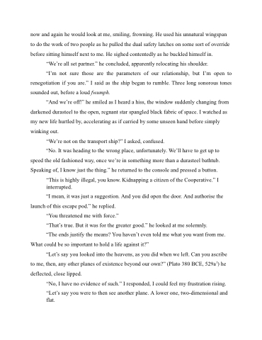 “This is highly illegal, you know. Kidnapping a citizen of the Cooperative.” I interrupted.