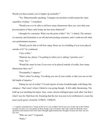 Taking me out of reality? I’d read reports of some breakthroughs with things like subspace. That wasn’t where I think he was going though. It felt oddly threatening. The GalCop was anything but injust. Sure, some citizens infringed upon each other, but that’s what I was for. Had been for. Ensuring that the law was just in its retribution to create the most social good. (Aristotle 323BCE, 1280b29)