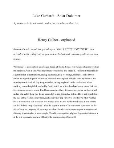 “Orphaned” is a song about an air organ being left to die. I made it at the end of spring break in my basement, with a Snowball microphone fed directly into audacity. The sounds recorded are a combination of synthesizers, analog keyboards, field recordings, melodica, and a 1960’s Italian air organ I acquired for free on Facebook marketplace 5 blocks from my house. I was working on this track all day using melodica, analog keyboard, and a synthesizer, when suddenly, around nightfall, my buddy Gavin texted me with a Facebook marketplace link to a free air organ near my house. I had been yearning all day for some impossible sublime sound, and as fate had it, there was the air organ, left to die. We rushed to the address and found it on the side of the road in a snowbank, soaked in water and subject to who knows what weather, but it miraculously still turned on and worked after me and my brother hauled it home in the car. I called the song “Orphaned” after the organ in honor of its near-death experience on the side of the road. Anyway, all my songs are about thunderstorms to one degree or another and this song is yet another prime example. The chip-tune synths and piano fragments that come in at the end represent a moment of levity, the storm passing, if you will.