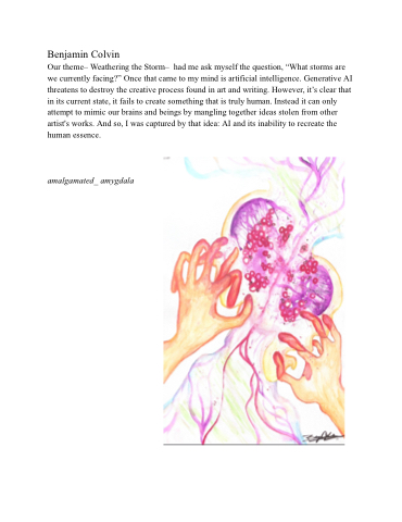 Our theme– Weathering the Storm– had me ask myself the question, “What storms are we currently facing?” Once that came to my mind is artificial intelligence. Generative AI threatens to destroy the creative process found in art and writing. However, it’s clear that in its current state, it fails to create something that is truly human. Instead it can only attempt to mimic our brains and beings by mangling together ideas stolen from other artist's works. And so, I was captured by that idea: AI and its inability to recreate the human essence.