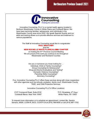 Innovative Counseling, PLLC is a mental health agency located in Northern Westchester County in White Plains and Cortlandt Manor. We have been servicing families, adolescents, and individuals in the Westchester County area since 2002. We speak Spanish fluently and our skills and training allows us to provide effective services and treatment to various populations.