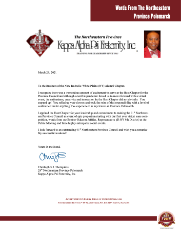 I applaud the Host Chapter for your leadership and commitment to making the 91st Northeast- ern Province Council an event of epic proportion starting with our first ever virtual cane com- petition, words from our Brother Hakeem Jeffries, Representative (D-NY 8th District) at the Public Meeting and three highly anticipated social events.