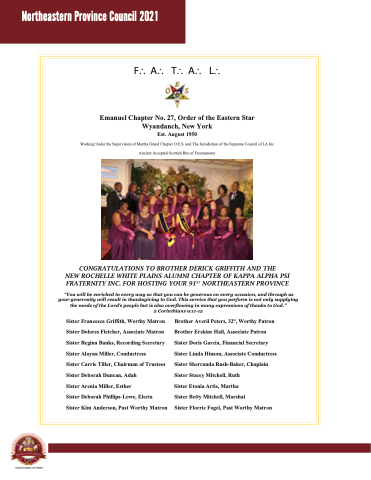 CONGRATULATIONS TO BROTHER DERICK GRIFFITH AND THE NEW ROCHELLE WHITE PLAINS ALUMNI CHAPTER OF KAPPA ALPHA PSI FRATERNITY INC. FOR HOSTING YOUR 91ST NORTHEASTERN PROVINCE