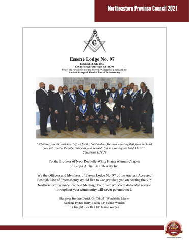 We the Officers and Members of Essene Lodge No. 97 of the Ancient Accepted Scottish Rite of Freemasonry would like to Congratulate you on hosting the 91st Northeastern Province Council Meeting. Your hard work and dedicated service throughout your community will never go unnoticed.