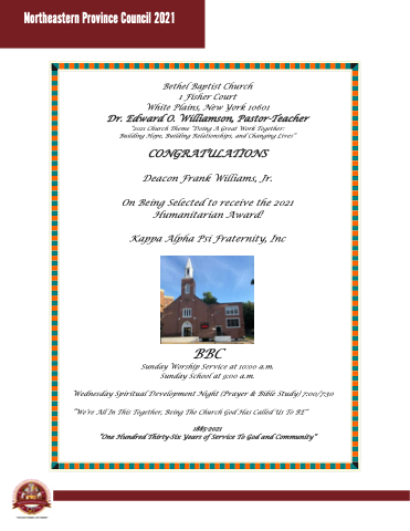 Dr. Edward O. Williamson, Pastor-Teacher “2021 Church Theme “Doing A Great Work Together: Building Hope, Building Relationships, and Changing Lives”
