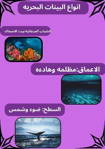 انواع البينات البحريه الشباب المرجانيه:بيت الاسماك الاعماق:مظلمه وهادءه السطح :ضوء وشمس
