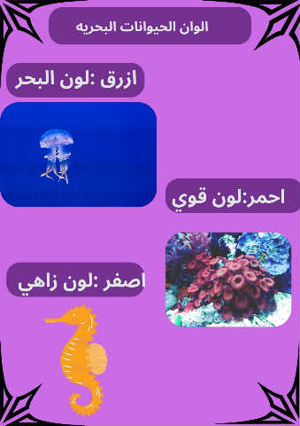 الوان الحيوانات البحريه ازرق :لون البحر احمر:لون قوي اصفر :لون زاهي