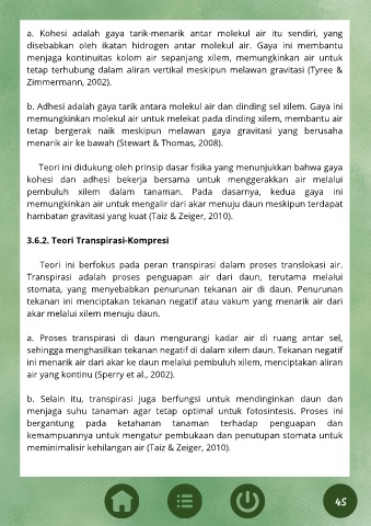 b. Adhesi adalah gaya tarik antara molekul air dan dinding sel xilem. Gaya ini