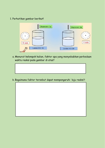 1. Perhatikan gambar berikut! a. Menurut kelompok kalian, faktor apa yang menyebabkan perbedaan waktu reaksi pada gambar di atas? b. Bagaimana faktor tersebut dapat mempengaruhi laju reaksi?