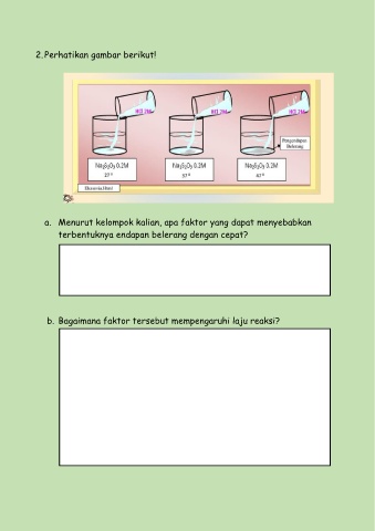 2. Perhatikan gambar berikut! a. Menurut kelompok kalian, apa faktor yang dapat menyebabkan terbentuknya endapan belerang dengan cepat? b. Bagaimana faktor tersebut mempengaruhi laju reaksi?