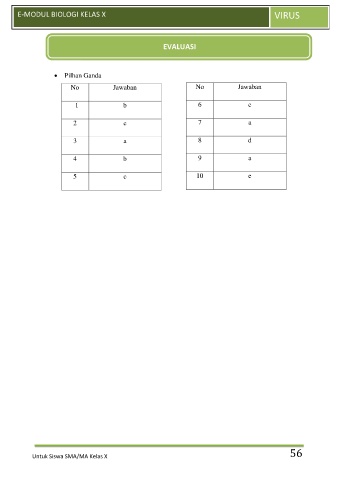 E-MODUL BIOLOGI KELAS X VIRUS EVALUASI Pilhan Ganda No Jawaban No Jawaban 1 b 6 e 2 e 7 a 3 a 8 d 4 b 9 a 5 c 10 e 56 Untuk Siswa SMA/MA Kelas X
