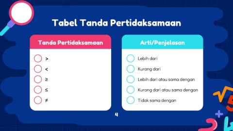 Tabel Tanda Pertidaksamaan Tanda Pertidaksamaan Arti/Penjelasan > Lebih dari < Kurang dari ≥ Lebih dari atau sama dengan ≤ Kurang dari atau sama dengan ≠ Tidak sama dengan 4