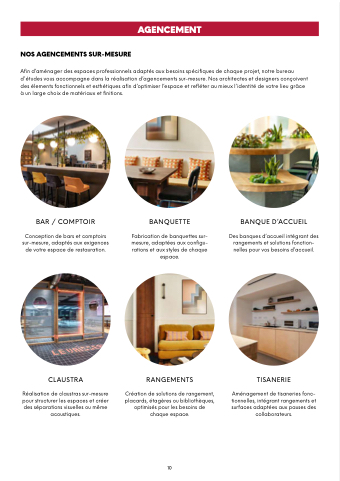 Afin d’aménager des espaces professionnels adaptés aux besoins spécifiques de de chaque projet notre bureau d’études vous accompagne dans la réalisation d’agencements sur-mesure Nos architectes et designers conçoivent des élements fonctionnels et et esthétiques afin d’optimiser l’espace et et refléter au mieux l’identité de de de votre lieu grâce à un large choix de matériaux et finitions CLAUSTRA