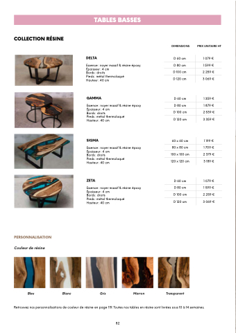 Retrouvez nos nos personnalisations de de couleur de de résine résine en en page 119 Toutes nos nos tables en en résine résine sont livrées sous 10 à 14 semaines 82