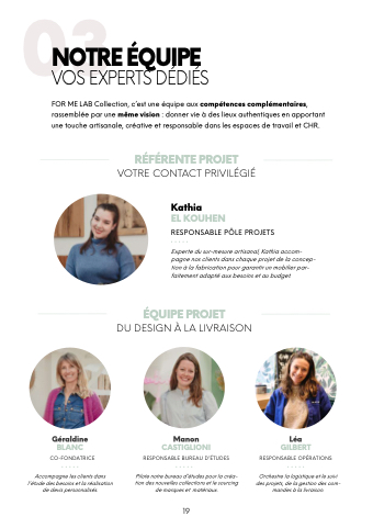 FOR ME LAB Collection c’est une équipe aux compétences complémentaires rassemblée par une même vision : donner vie à des lieux authentiques en en apportant une touche artisanale créative et et responsable dans les espaces de travail et et CHR RÉFÉRENTE PROJET