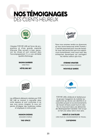 FOR ME LAB a a a a élaboré et réalisé pour le groupe Capgemini du mobilier ex- ceptionnel qui donne une identité et un un caractère propre à nos environnements de d travail Artisans avant tout et créa- tifs ils s’inscrivent dans une démarche d de d développement durable c’est ce qui en en en fait une valeur sûre à mon sens HERVÉ LE CHATELIER