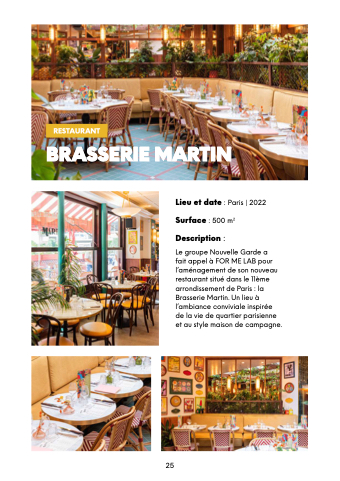 Description : Le groupe Nouvelle Garde a a a a à fait appel à FOR ME LAB pour l’aménagement de son nouveau restaurant situé dans le 11ème arrondissement de Paris : la Brasserie Martin Un lieu à l’ambiance conviviale inspirée de de de la vie de de de quartier parisienne et au style maison de de de campagne 25