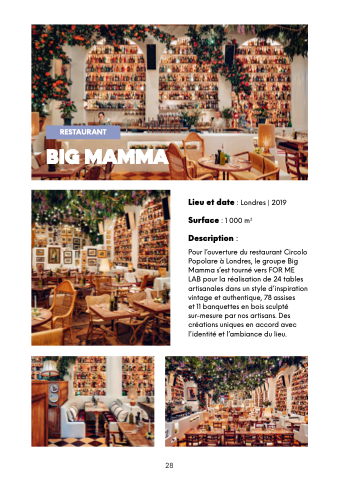 Pour l’ouverture du restaurant Circolo Popolare à Londres le groupe Big Mamma s’est tourné vers FOR ME LAB pour la réalisation de 24 tables artisanales dans un style d’inspiration vintage et et et authentique 78 assises