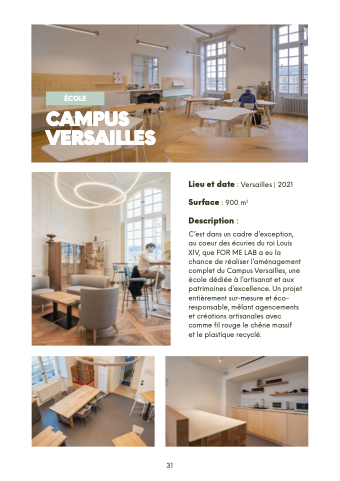 C’est dans un cadre d’exception au coeur des écuries du roi Louis XIV que FOR ME LAB a a a a a a a eu eu la chance de réaliser l’aménagement complet du Campus Versailles une école dédiée à l’artisanat et et aux patrimoines d’excellence Un projet entièrement sur-mesure et éco- responsable mêlant agencements et créations artisanales avec comme fil rouge le le le l chêne massif