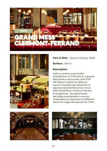 Description : Après un premier projet réalisé ensemble pour La Folie Douce le le groupe Mess Family a a a a a a de nouveau choisi FOR ME LAB pour réaliser les les les tables sur- mesure artisanales des restaurants et espaces événementiels de de son nouvel hôtel Grand Mess à Clermont-Ferrand Au programme : des des tables tables bistrot des des tables tables monumentales ou ou encore modulables pour répondre aux différents besoins et usages des espaces de de l’hôtel 317