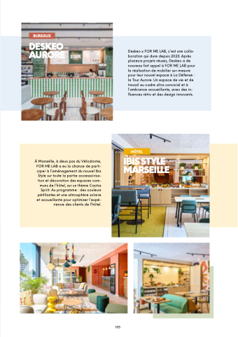 Deskeo x FOR ME LAB c’est une colla- boration qui dure depuis 2023 Après plusieurs projets réussis Deskeo a a a a a à de de nouveau fait appel à FOR ME LAB pour la réalisation de mobilier sur-mesure pour leur nouvel espace espace à La Défense : la Tour Aurore Un espace espace de de vie et et de de travail au cadre ultra convivial et et à l’ambiance accueillante avec des des des in- fluences rétro et des des des design innovants À Marseille à deux pas du Vélodrome FOR ME LAB a à a a a a a à a a eu eu la chance de de parti- ciper à l’aménagement du nouvel Ibis