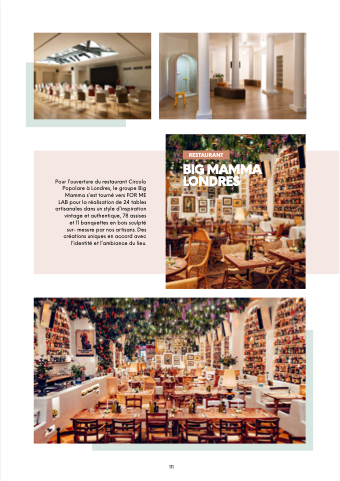Pour l’ouverture du restaurant Circolo Popolare à Londres le groupe Big Mamma s’est tourné vers FOR ME LAB pour la réalisation de 24 tables artisanales dans un style d’inspiration vintage et et et authentique 78 assises et et et 11 banquettes en en bois sculpté sur- mesure par nos artisans Des créations uniques en en accord avec l’identité et l’ambiance du lieu BIG MAMMA LONDRES